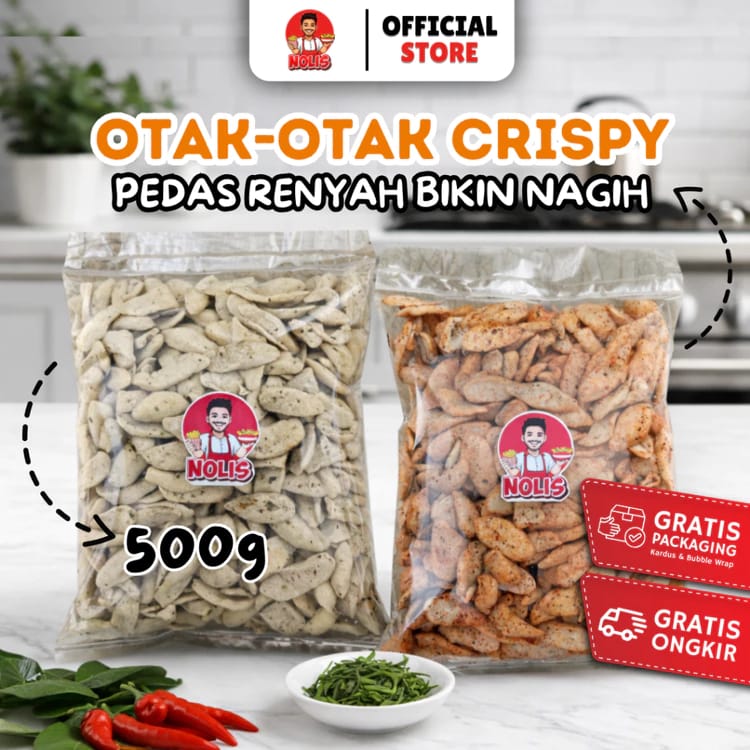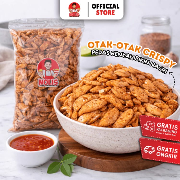 Otak-otak crispy hadir dengan varian original dan pedas aroma daun jeruk. Selain bisa langsung dicemil, camilan ini juga enak dicampur nasi hangat atau mie.